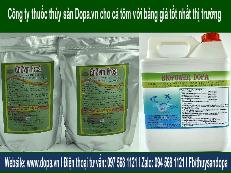 Dopa.vn là công ty thuốc thủy sản với bảng giá thuốc cho cá, tôm, ếch chất lượng, hiệu quả tốt nhất thị trường. Chúng tôi cung cấp thuốc thủy sản cho cá, thuốc thủy sản cho tôm, thuốc thủy sản cho ếch… thuốc thủy sản phòng và trị các bệnh thường gặp cho cá, tôm, cua, ếch, baba…. Chế phẩm vi sinh, chế phẩm sinh học, chế phẩm EM gốc tận nơi trên toàn quốc.