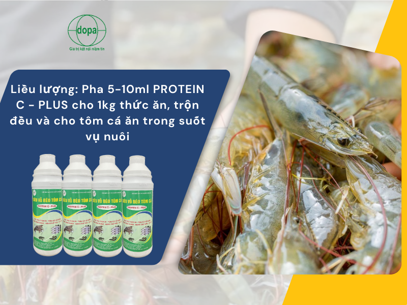 - Liều lượng: Pha 5-10ml PROTEIN C - PLUS cho 1kg thức ăn, trộn đều và cho tôm cá ăn.
