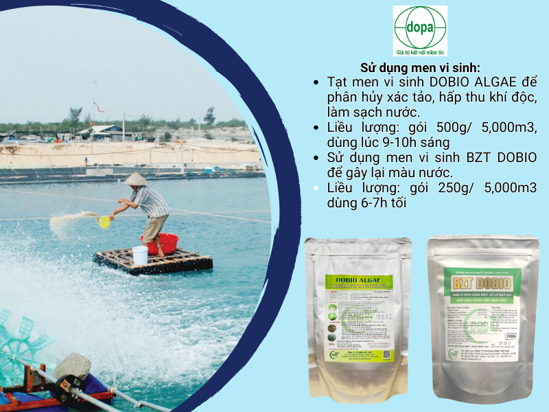 - Liều lượng: DOBIO ALGAE gói 500g dùng cho 5,000m3, sử dụng lúc 9-10h sáng, đánh liên tục 5-7 ngày.